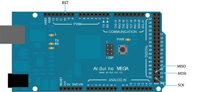 Next and very important thing you should know is that pins you need of the Arduino, the pins you need is SCK, MISO, MOSI and RST and for Arduino mega these pins correspond