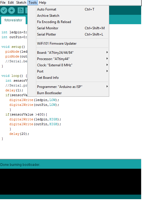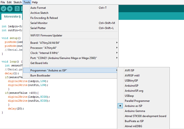 For the embedded programing is a simple program, I use the Arduino mega for upload the program in the microprocessor, the first step for programming the attiny 44A with