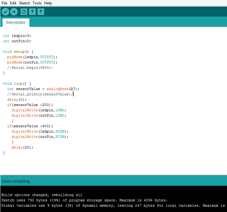 The program is simple let's use two pins one for the photoresistor and the second for the signal to send the relay plaque, this pin we declare it as output in void setup