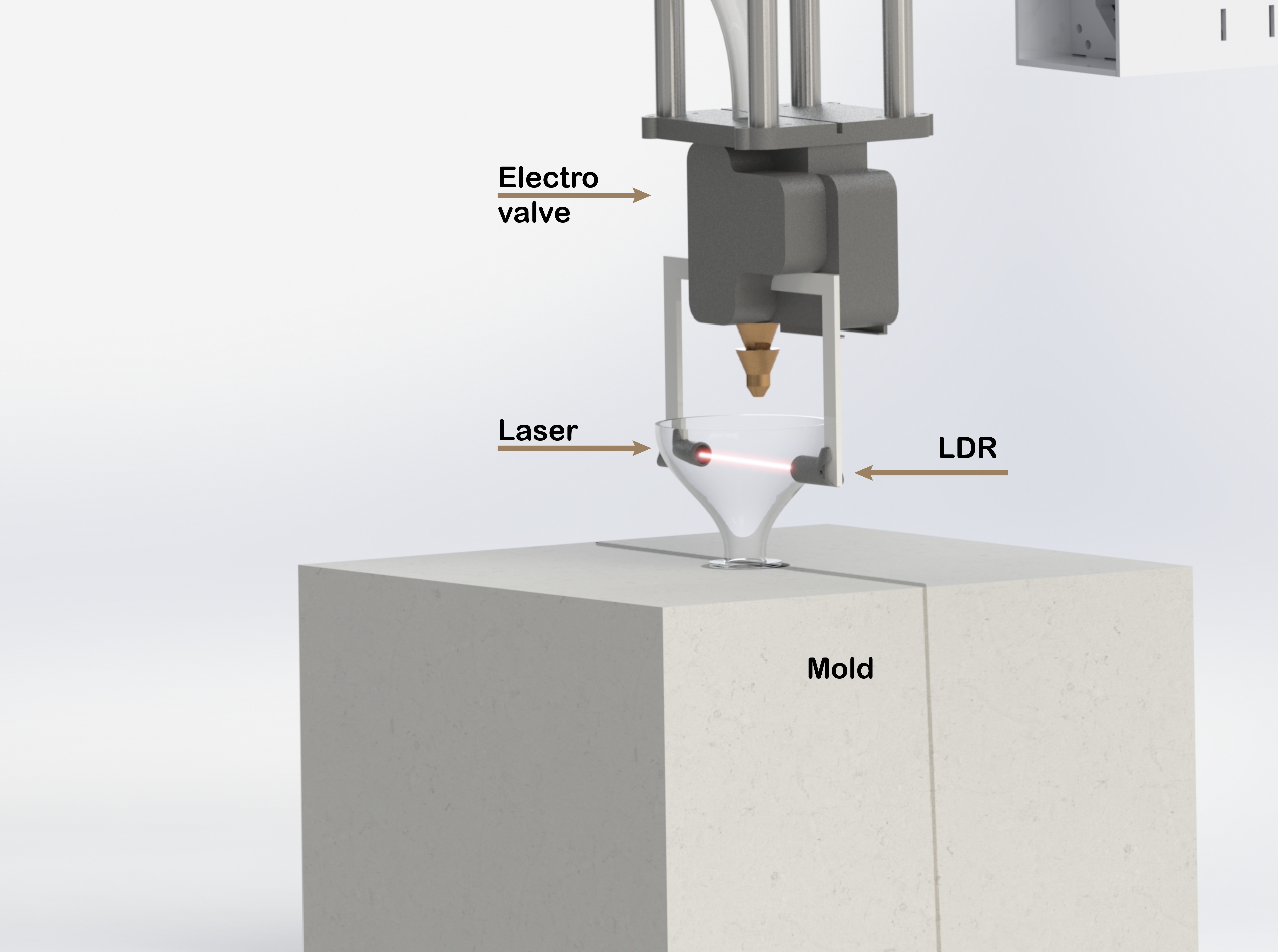 liquid through it, when the liquid interrupt the laser light will react the photo resistance and will close the electro valve and means that the mold will be full.