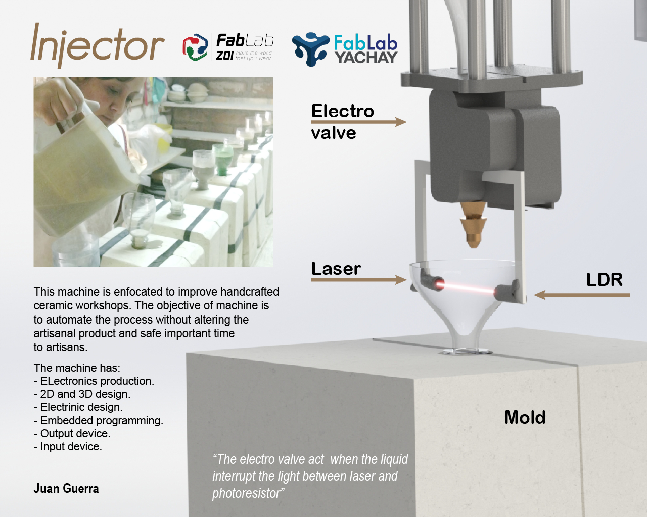 To control the amount of liquid, I going to use an electro valve for controlling the passage of the liquid into the mold, the control of the electro valve is for the data
