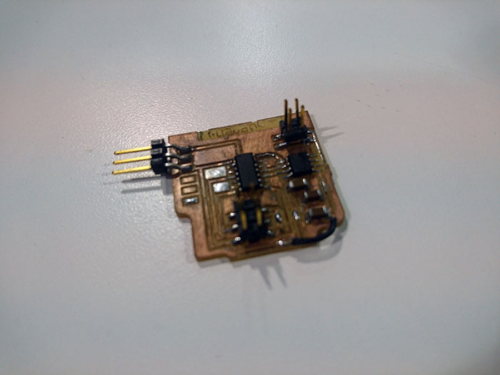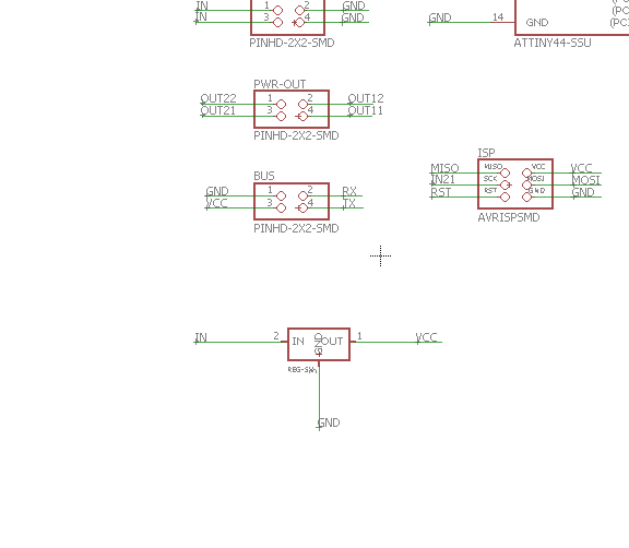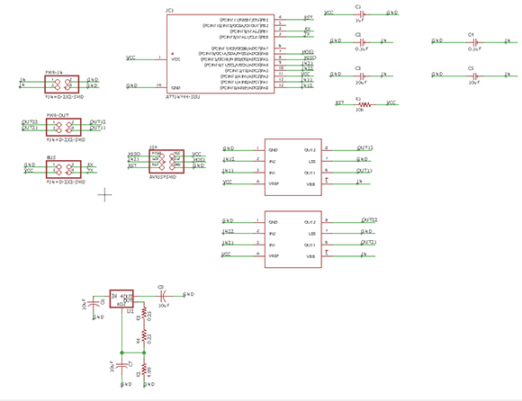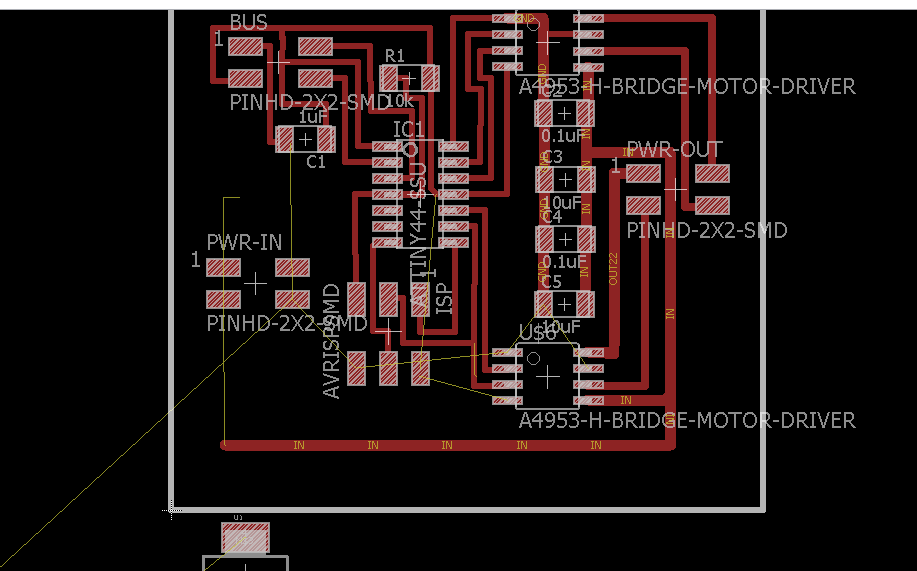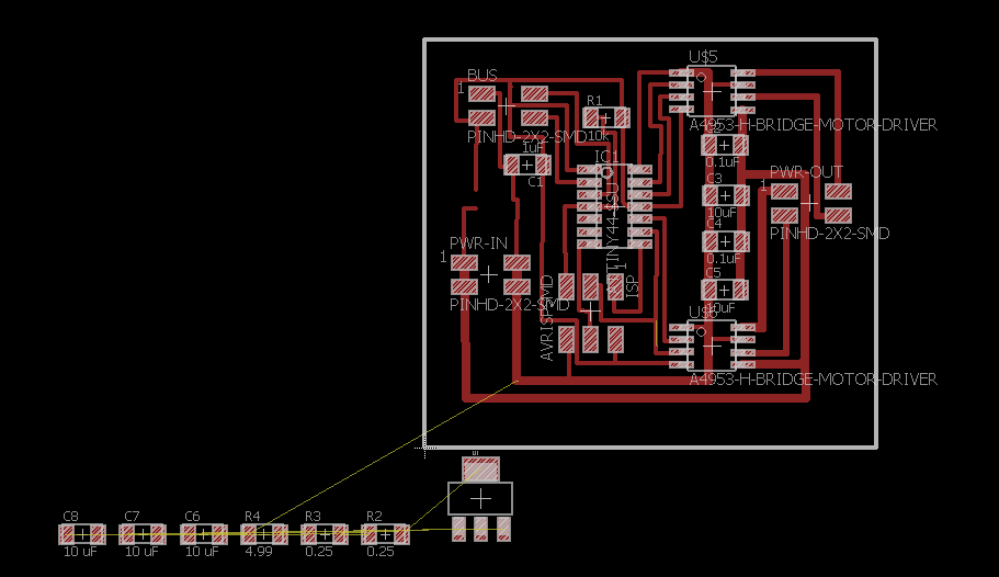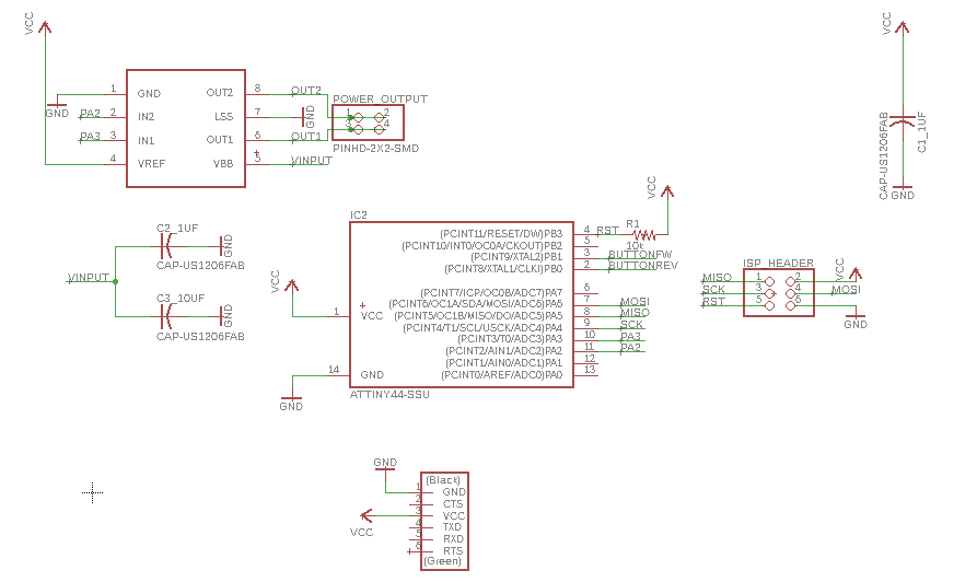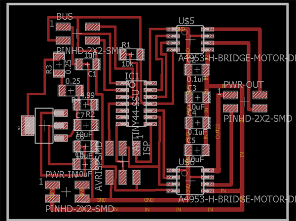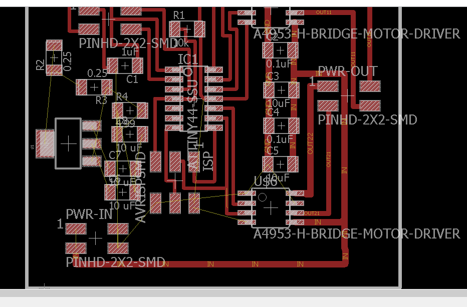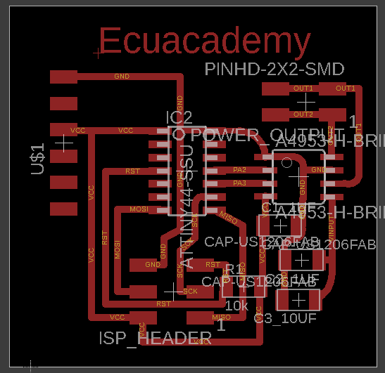 For taste the motor driver A4953, I simplified more the circuit omitting the regulator and one diver, all the changes first in the software eagle and add an angle header, this is to polarize the plaque at the time of burn bootloader and the program, in the first circuit have a problem whit the plaque because the tracks joined and I could not find it, in the second circuit the design is right and can program it.