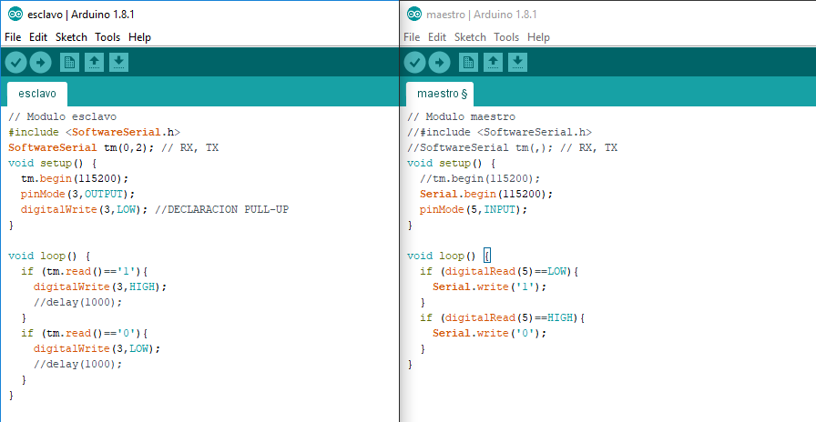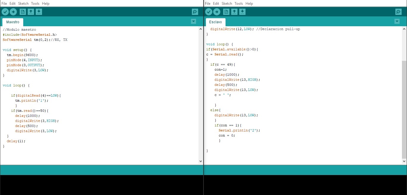 For the programming I make two one to master and other for the slave, the communication between the two it is done through tx and rx, where the one will send the information and the other will receive it through a led.
