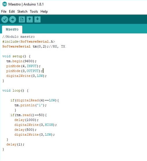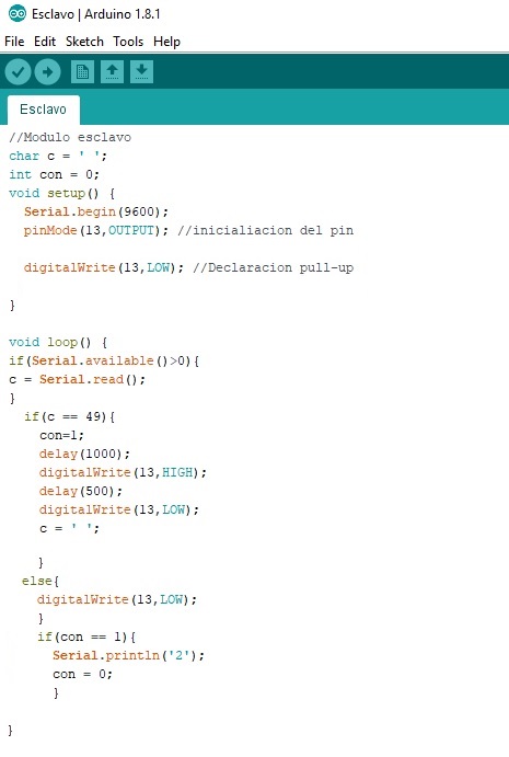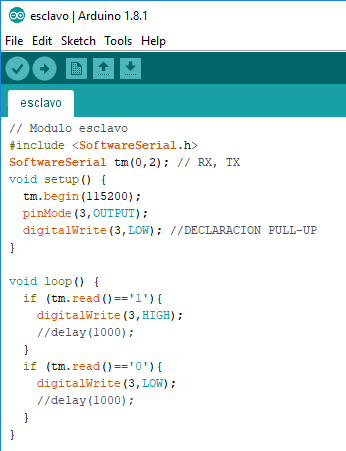 For the program the slave is a little different, first include the library SoftwareSerial, we have to declare this library since the plate we will use does not have a tx and rx pin, therefore this allows us to assign with the command SoftwareSerial tm(0,2); when the left number is rx and right tx, then declare the velocity, must be the same that the master, declare the pin assigned to turn on the led as output and in a low state, next with tm.read send to read the data sent by the serial port and if it is a 1 the led will light if it is a 0 it will turn off, I recommend not use the command delay because generates problems in communication.