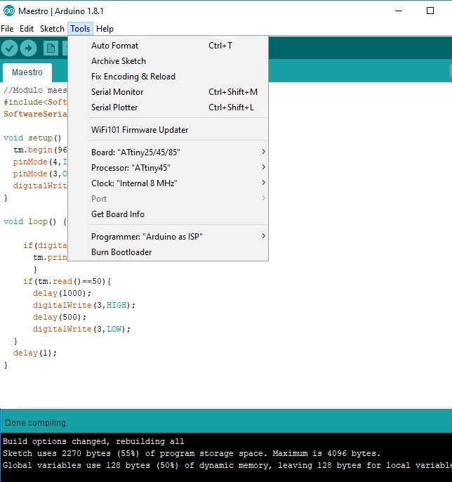 For the programming of the master I include the library of software serial to set the pins in the attiny board like TX and RX, in this case I use the 0 and 2 pins, in void setup I declare the beginning and speed of communication. In void loop only use the judgment if, in the first if use to only make the process when you press the button in my case for the configuration first is in high or 1 logic and when I press the button change to low or 0 logic and send the 1 to the communicate. In the next if is to read the data when the other board send. Be careful when you send this way the commination changes the data to ascii code and the 1 in ascii code is 49. I use de command delay the first (delay(1000)) is to create a loop and the second is to wait a while before turning off the led and third is to stabilize communication.