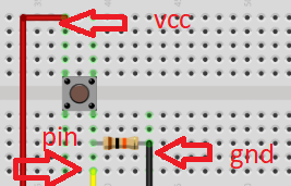 Show the connection of the button to a pin of a satshakit next connect the rx and tx pins make sure that the rx of the satshakit connect with the tx of rx to the board and rx to tx of the board.