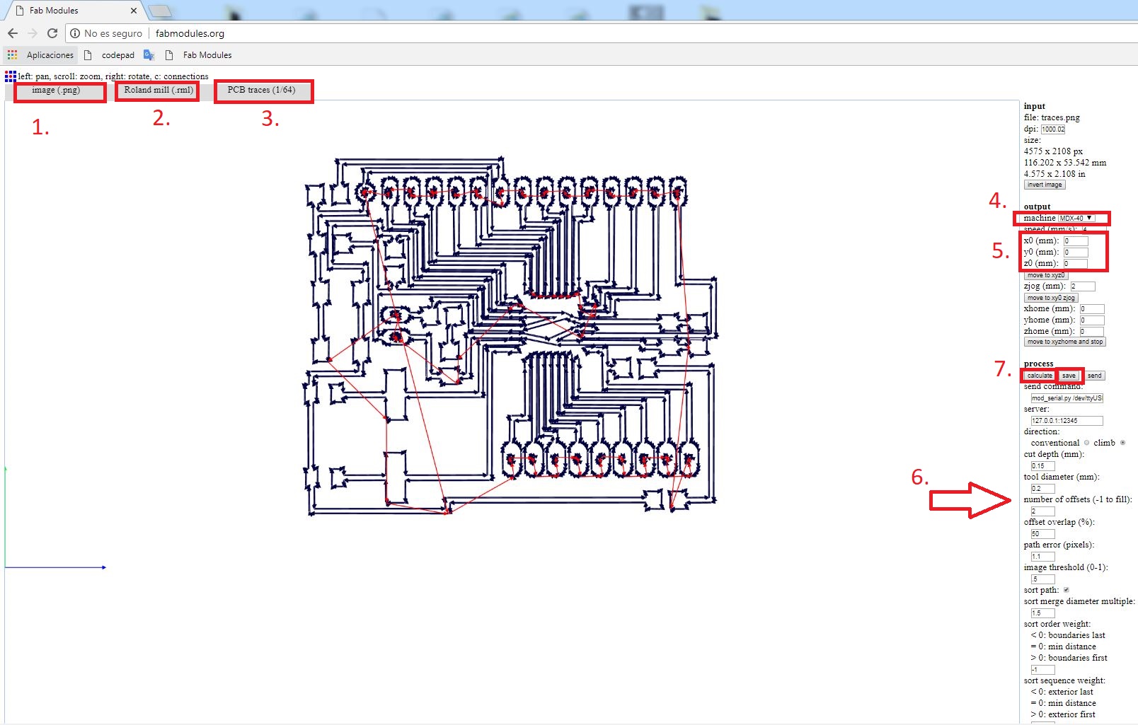 To mechanize the satshakit make the image and upload to fabmodules, first select the file, second select the type of file you want to convert, third type of mill if need make the treaces use 1/64, and 1/32 to cutout, fourth select type of machine, fifth give the zero point, sixth configurate the parameters to you give the machine, seventh press in calculate and save the file.