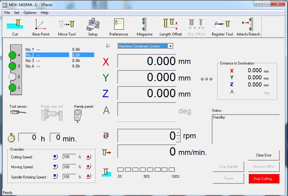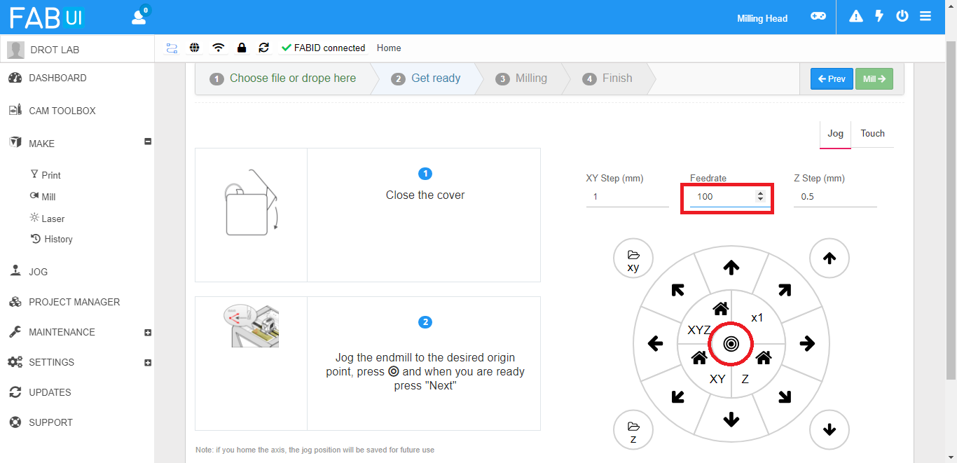 to set the machine use the panel to appear and when you have located it press the center button to save the zero point, remember the mill must stick to the plate at the zero point in z and change the feedrate in the panel because it's a lot of speed in the displacement and it will break the milling cutter.