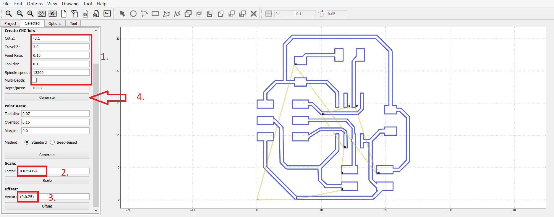 In the first parameters configurate the parameters to the machine first depth in the axis z, then the how much will rise when you are not doing roughing, the velocity to go the machine, tool diameter and spindle speed, then chance the scale because to import the file this change the size and you must adjust, in offset you set the file in the zero point and finally generate the gcode.
