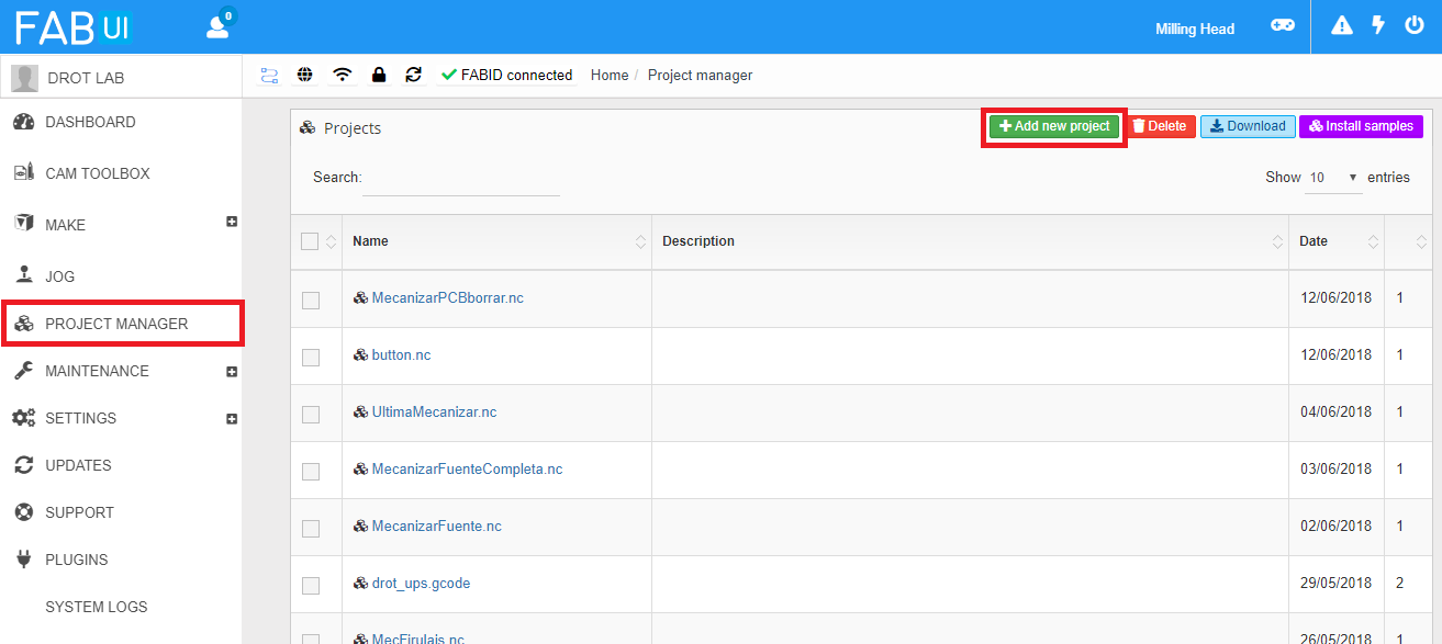 Next upload in the software of machine create a new project if you want and drag the file into the area press in save and next in the file press in mill to continue.