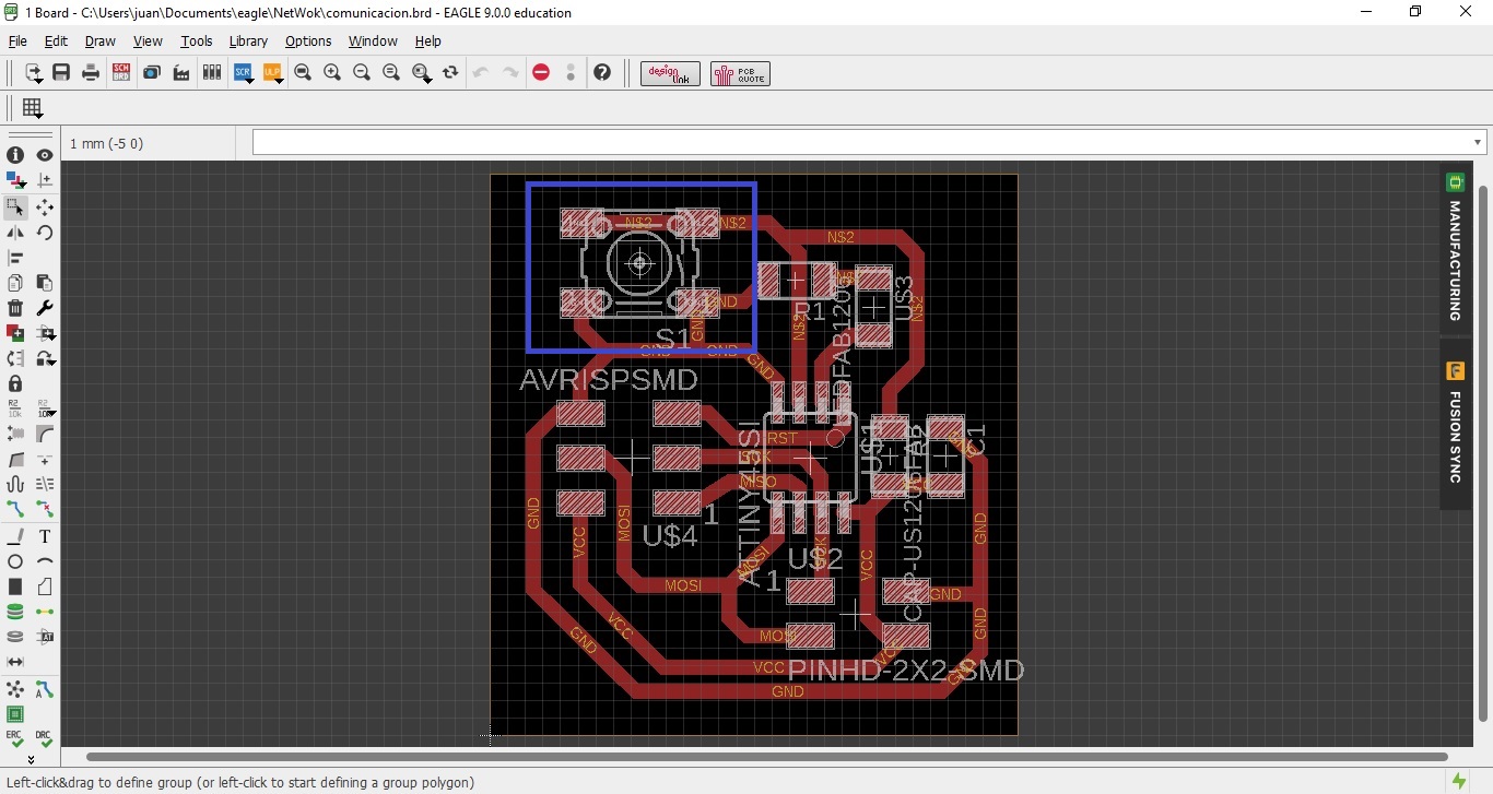 In the board in eagle to make the design I use button group and move to select the devices and move them, then with the button change use to adjust the width of the traces, and finally with route and ripup for make the traces in the design.