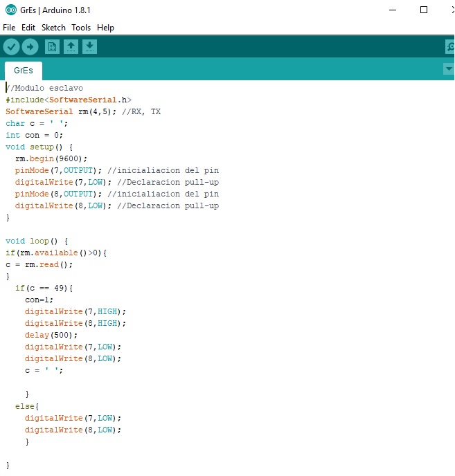 In the program GrEs also use the library software serial and declare the pin 4, 5 like RX and TX and declare a variable to save the value of read in the software serial, next in void setup start the serial in 9600 baud and declare the pin 7, 8 and the state like low.