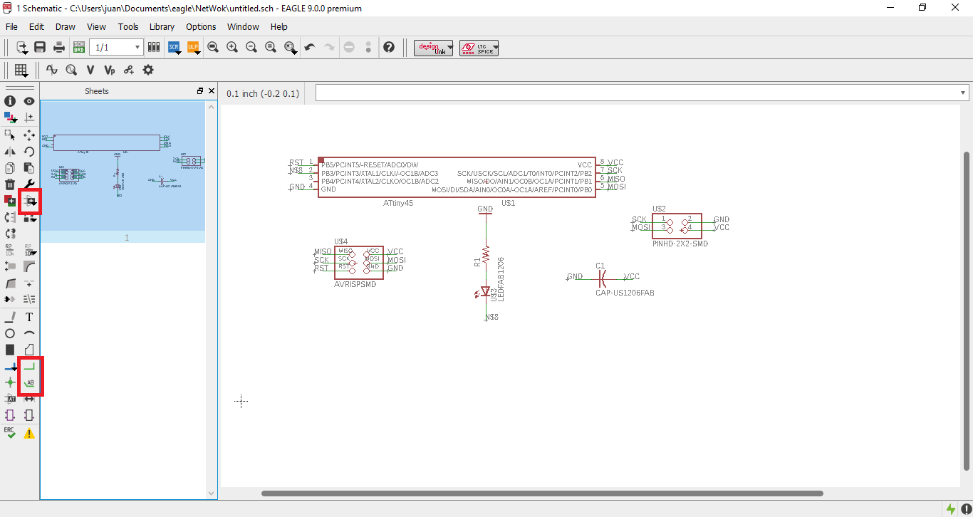 For the slave boar I made in eagle in the schematic I use 3 tools to make, firs use button add to select all the devices what you need I use: attiny 45, capacitor, resistance, LED and pin headers 2x2, 2x3, then with net and label make the connection.