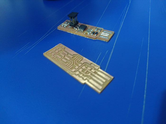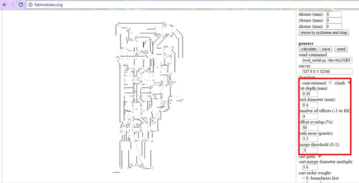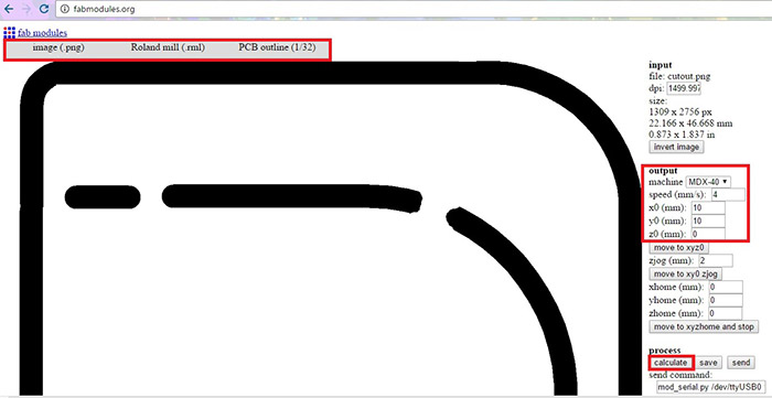 when get the image of the circuit, open with fabmodules and set the parameters: output format in roland mil, size of drill 1/64 for traces and 1/32 for cut. next choose the machine whit which we are going to work in, Try zhome, yhome, xhome at 0 to finish the machine process and return to the starting point but were not those parameters and change for x0, y0 and z0, finally look at all the parameters that are correct and select calculate from get the file you are going to work on the machine.