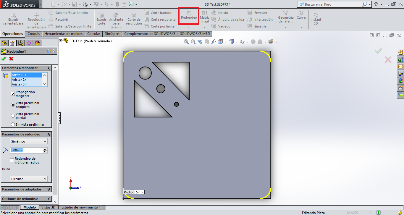In this step I use the command “Rounding” to eliminate the beaks in the corners and for the machine not lift the piece.
