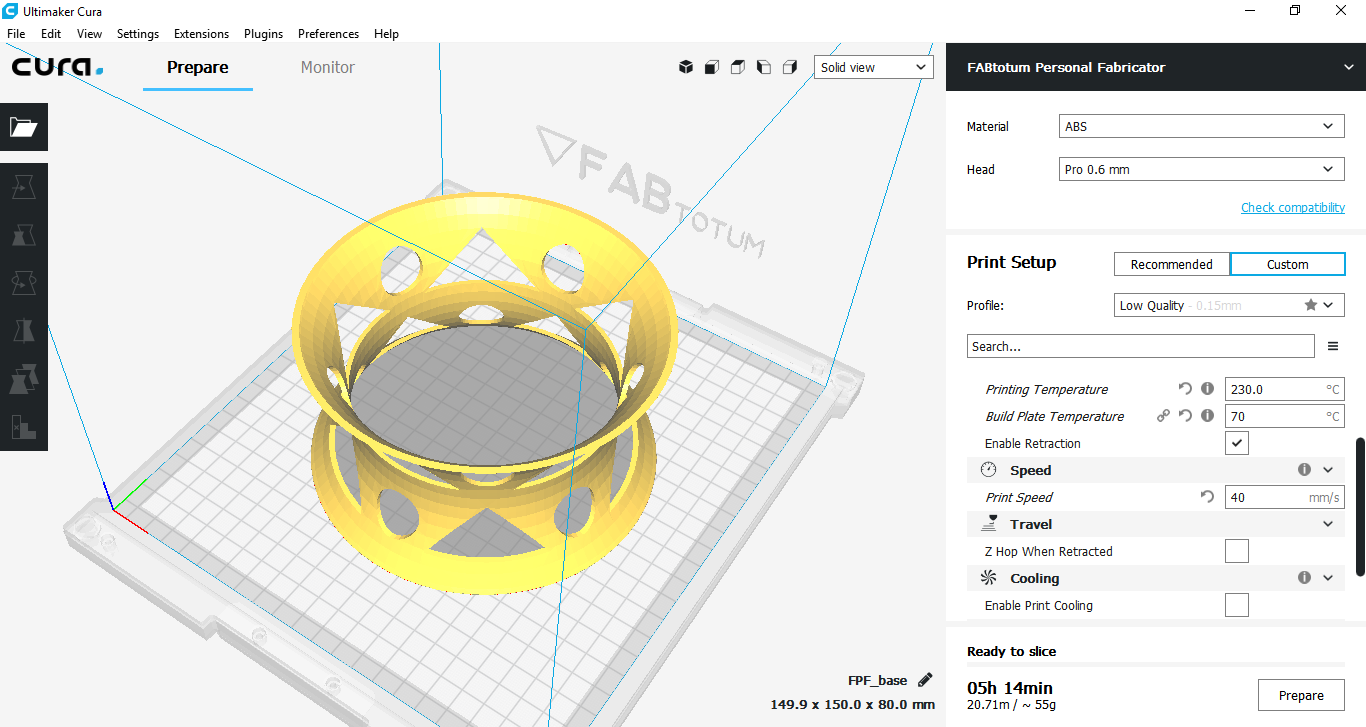 Next in the software cura to create the gcode file but first configurate the different parameters of the printer, printing temperature in 230 and 70 degrees the build plate, slow down to 40 mm/s, and disactivate the cooling, I recommend the build plate adhesion select brim.