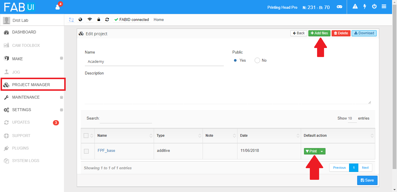 And finally, to upload at the machine select project manager next press in add files and then in print.