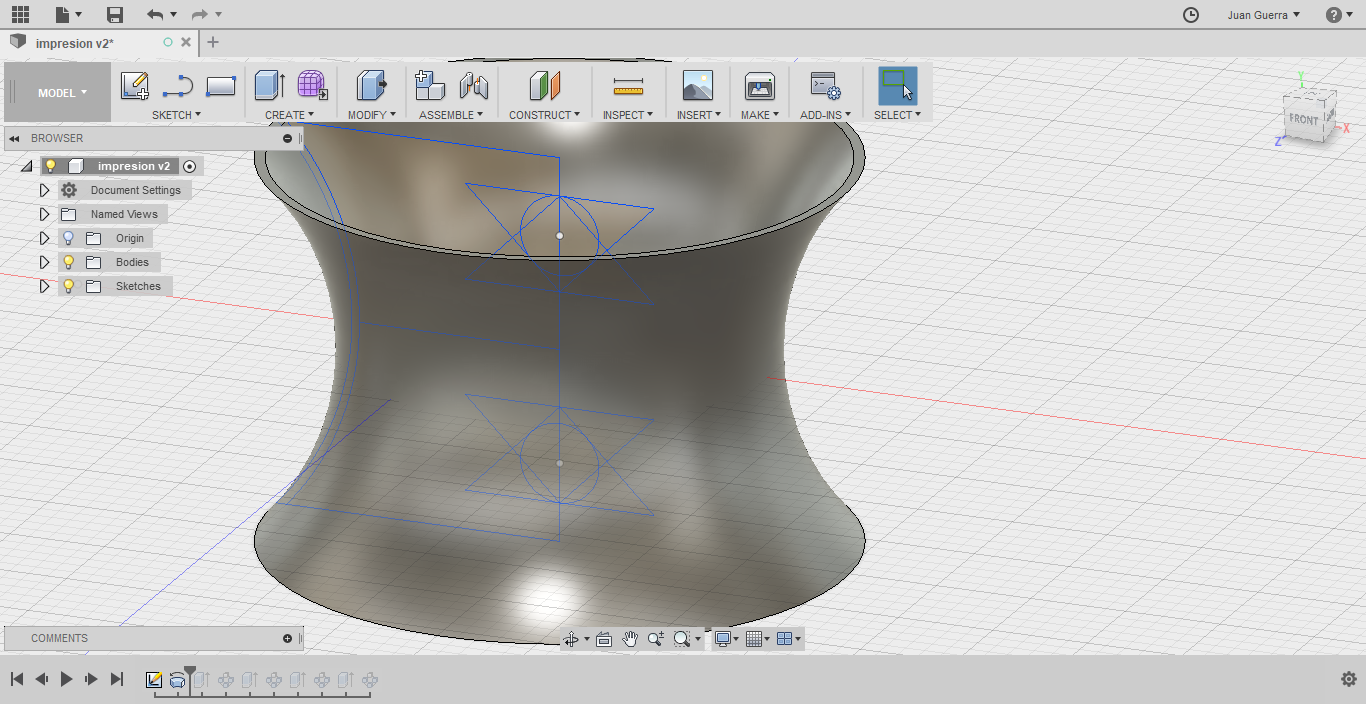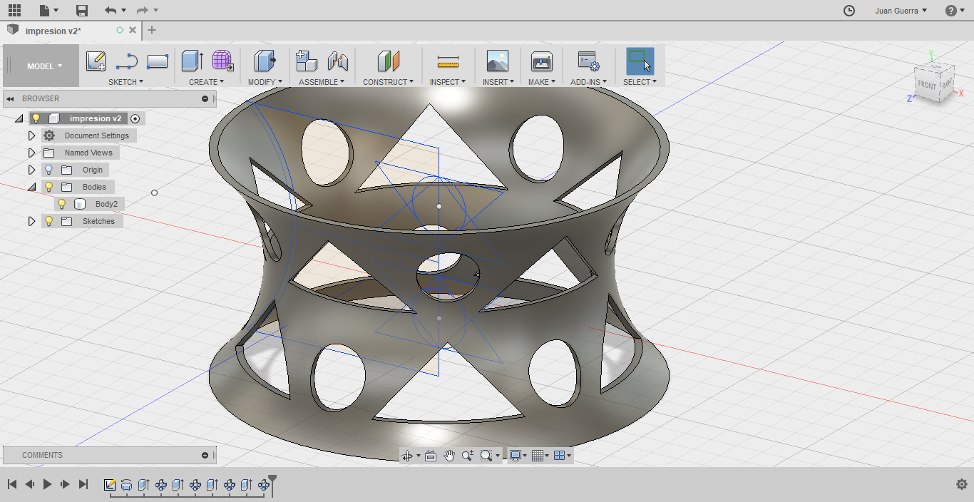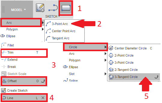 To the design, I occupy the software fusion 360, first create a sketch, 1. With the tool rectangle we make the basis of the design, 2. Use the arc to curve a side of the rectangle, give three to insert the arc in the sketch, 3. Use offset to make a parallel line, the distance of the line is 2mm, then with tool trim delete all the excesses, 4. Use line to make the triangles, be sure that the angle of the base of the triangles is 45 degrees, this is for the impression not use support, finally 5. Circle option tangent to make inside of triangle.