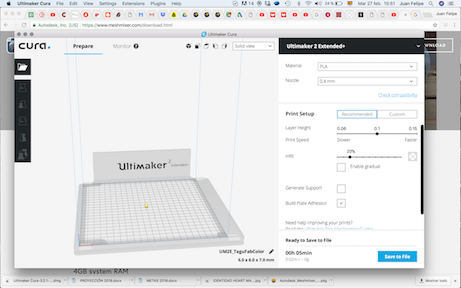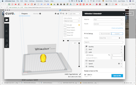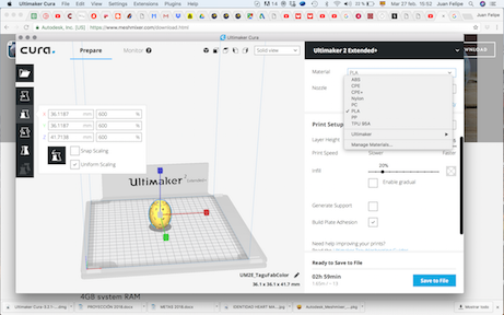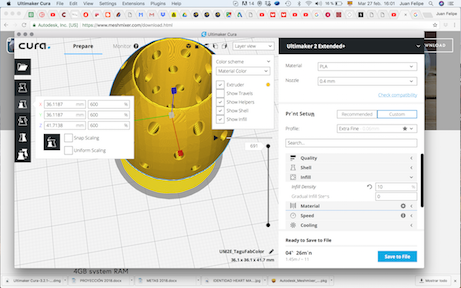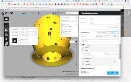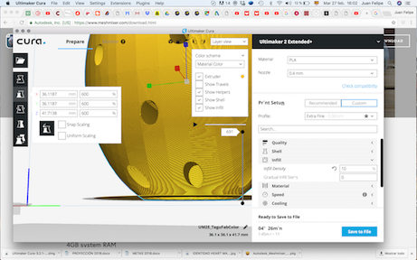 I am very impressed to see the big difference that can be made in the 3d printing configuration of the machine. The same 3d model can have different results from very bad to very good depending only on the configuration. For the Scan exercise, I did several tests. I was very interested in knowing the software that allows to do this and try to get the best result. I compared the quality of some Free Mobile Apps: 123D Catch, Trnio, Scann3D and Seene, being the last of the best results. We also did tests with my friends, scanning our entire body. Kinect is excellent for large scale figures, although it requires a lot of precision from the person doing the registration and a lot of stillness from the person being scanned. Finally I managed the visit to a laboratory of a university to test the accuracy of the Scanner Picsa de Roland, is the scaner with which I achieved greater precision for small pieces such as tagua seed. The detail is almost perfect, even though the result is mesh and it is not easy to edit it to reach 100% of the shape.When exporting the file the size of the piece was very small, in Cura I resized it to the real scale.