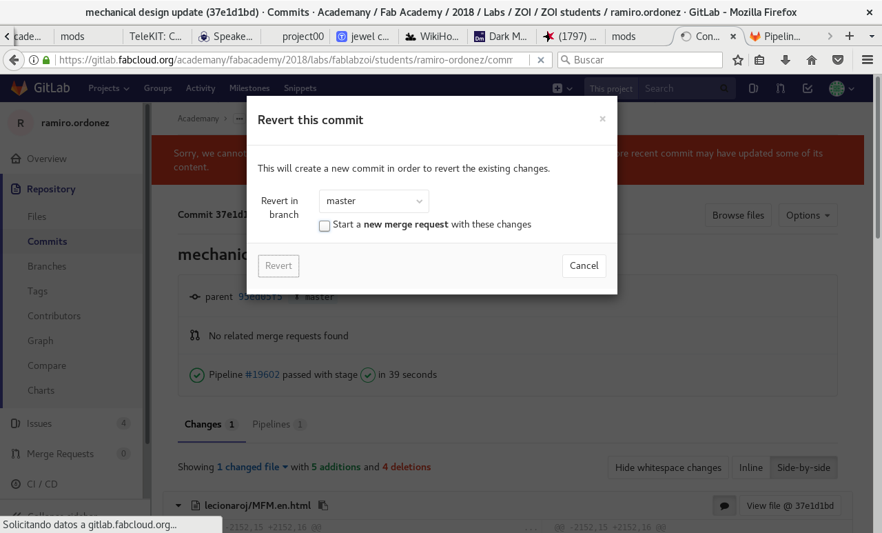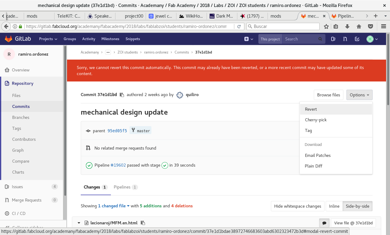 git clone URL_of_repository to use a premade personal repositorygit status to see what files have changedgit diff name_of_file to check the changes I have made to each filegit add name_of_file to each file in a group of changesgit commit -m "description of the changes made to the group"git checkout name_of_file to recover a file from the last commitI had trouble uploading my files to the server because I did not use the correct user name. I tryed several names and then realized that the user name I had asked for (quiliro) had not been used by FabAcademy administration. ramiro.ordonez had been used. So finally, after 4 weeks and no guidance, I could figure it out myself.