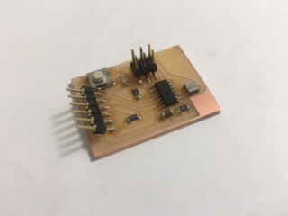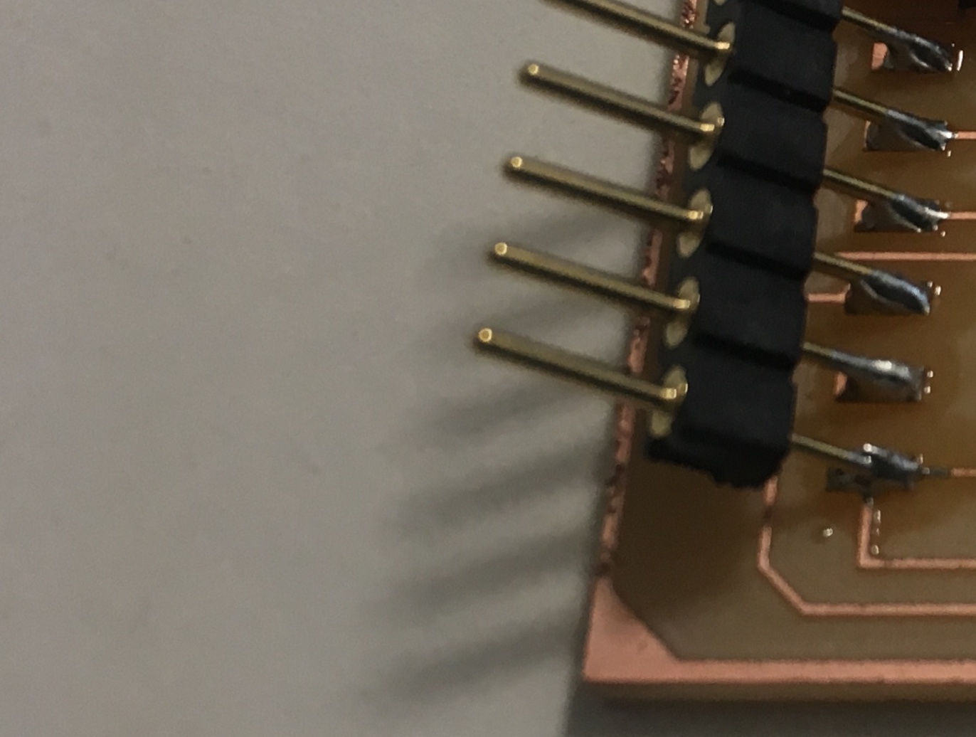 Once I had my milled PCB, I went to work stuffing it with the components, starting with the FTDI header. As Neil said, it is important to have this component near the edge of the circuit and I didn't remembre it, so I had it in a delicate place, on top of some traces.