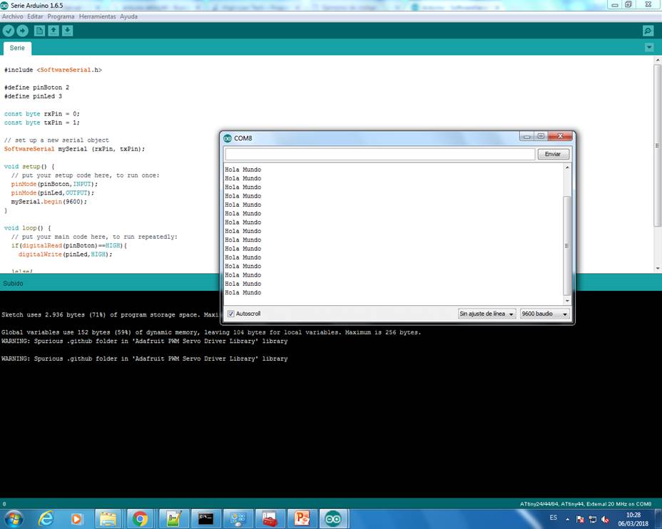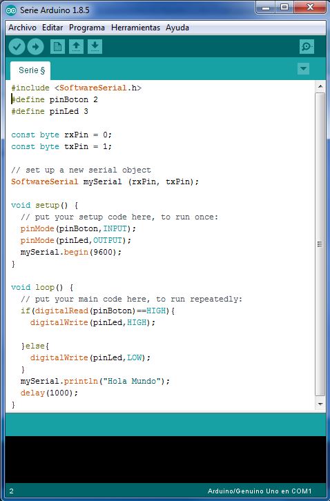 It says "Hola mundo" (Hello world) and when I push Button in PCB the Led switches on, yeah!