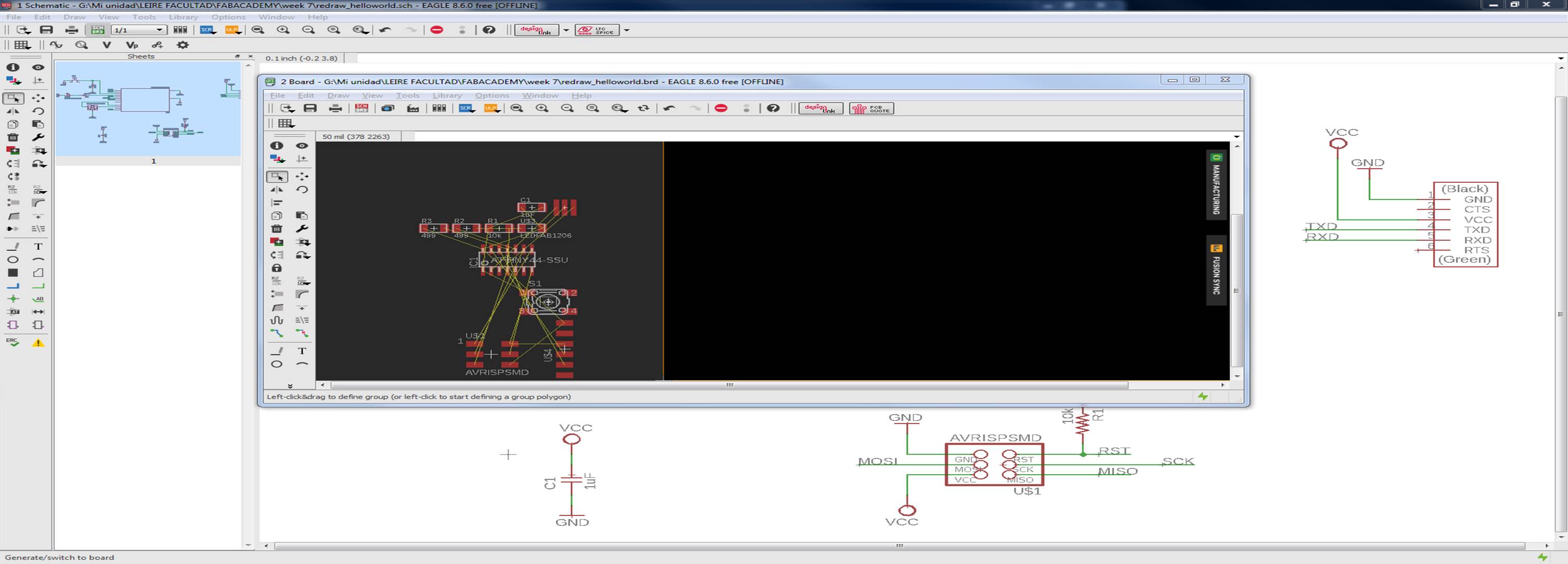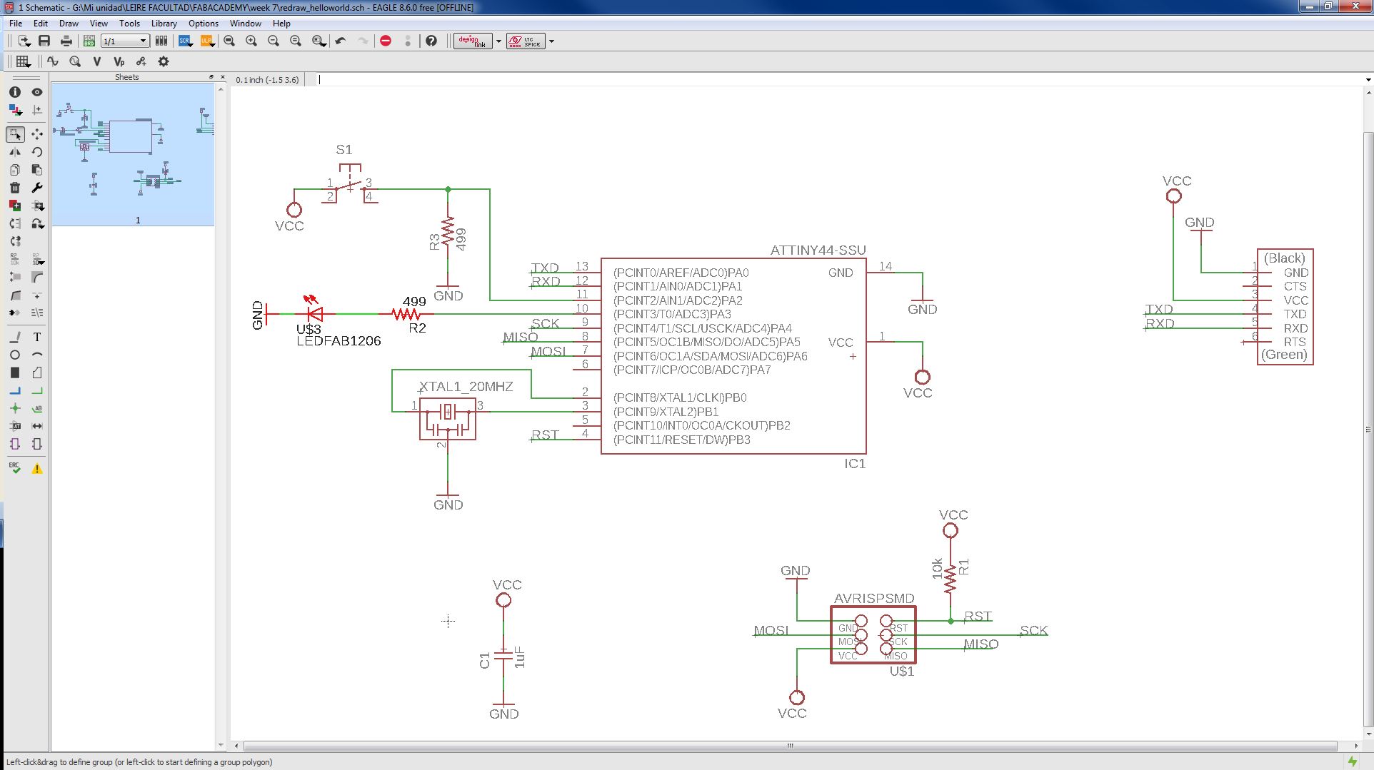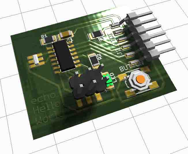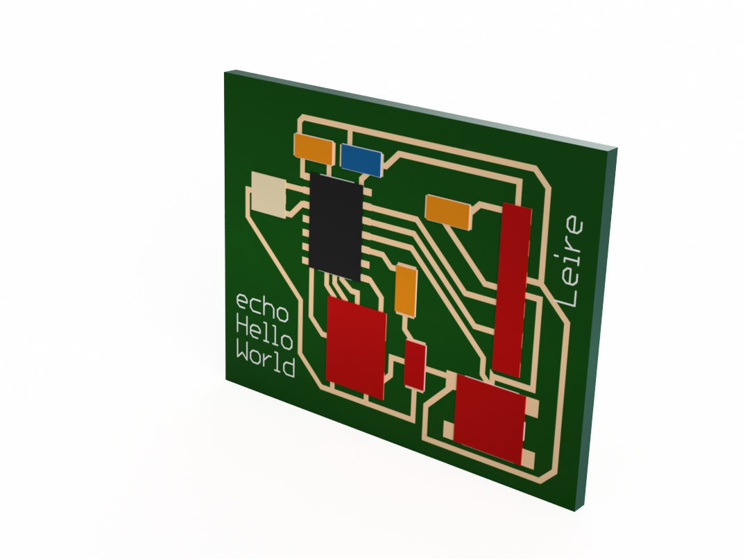 INDIVIDUAL ASSIGNMENT: _ redraw the echo hello-world board. + add (at least) a button and LED (with current-limiting resistor). _ check the design rules, make it, and test it. _ extra credit: simulate its operation. _ extra credit: render it. (3D) GROUP ASSIGNMENT: _ use the test equipment in your lab to observe the operation of a micro-controller circuit board, use the circuit made in the individual assignment
