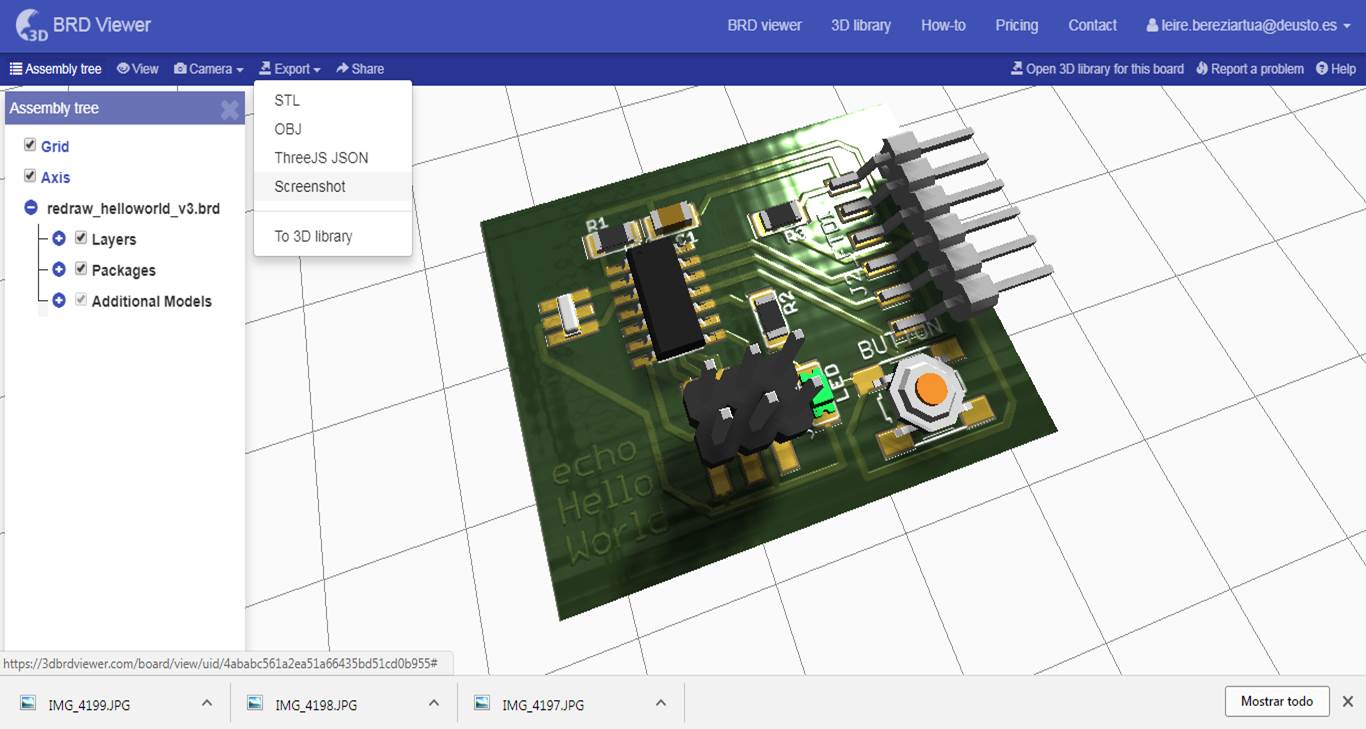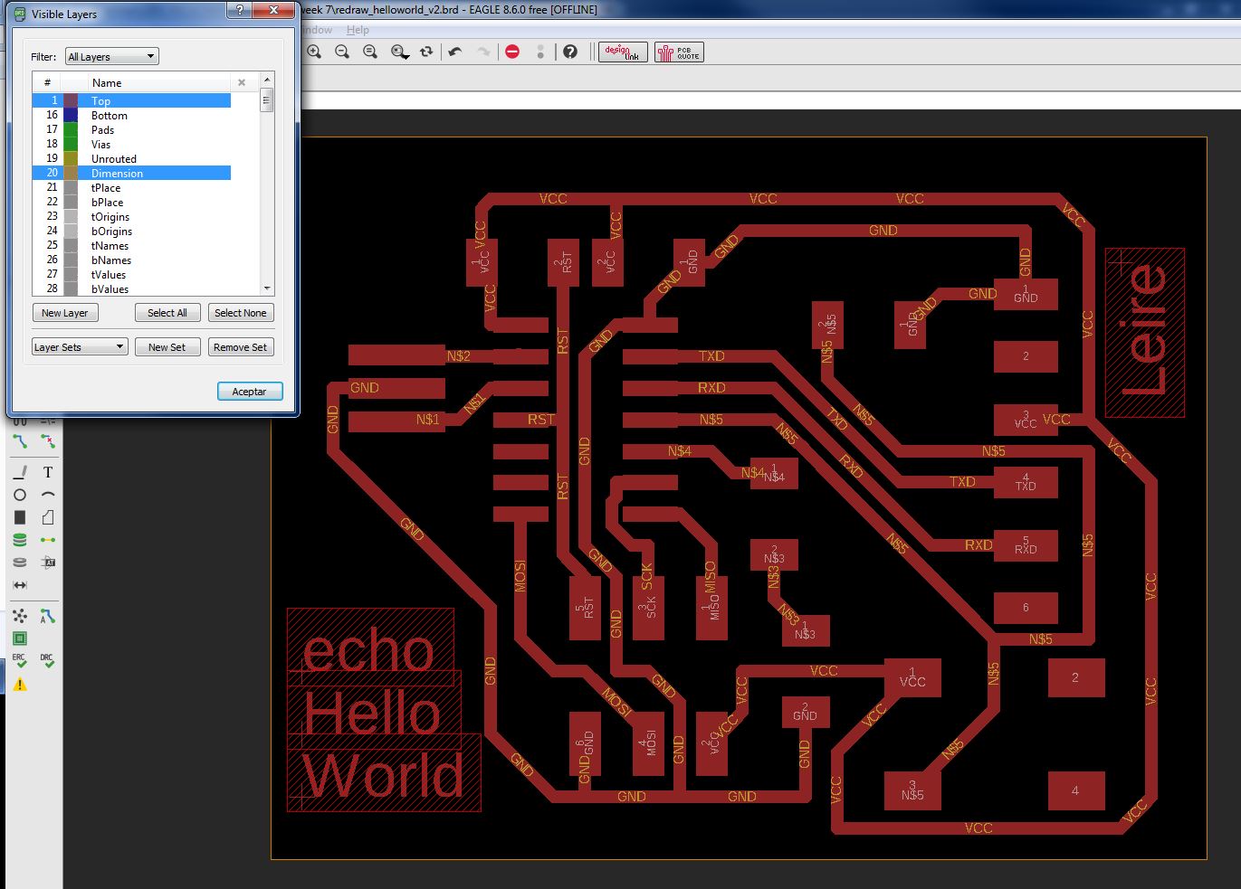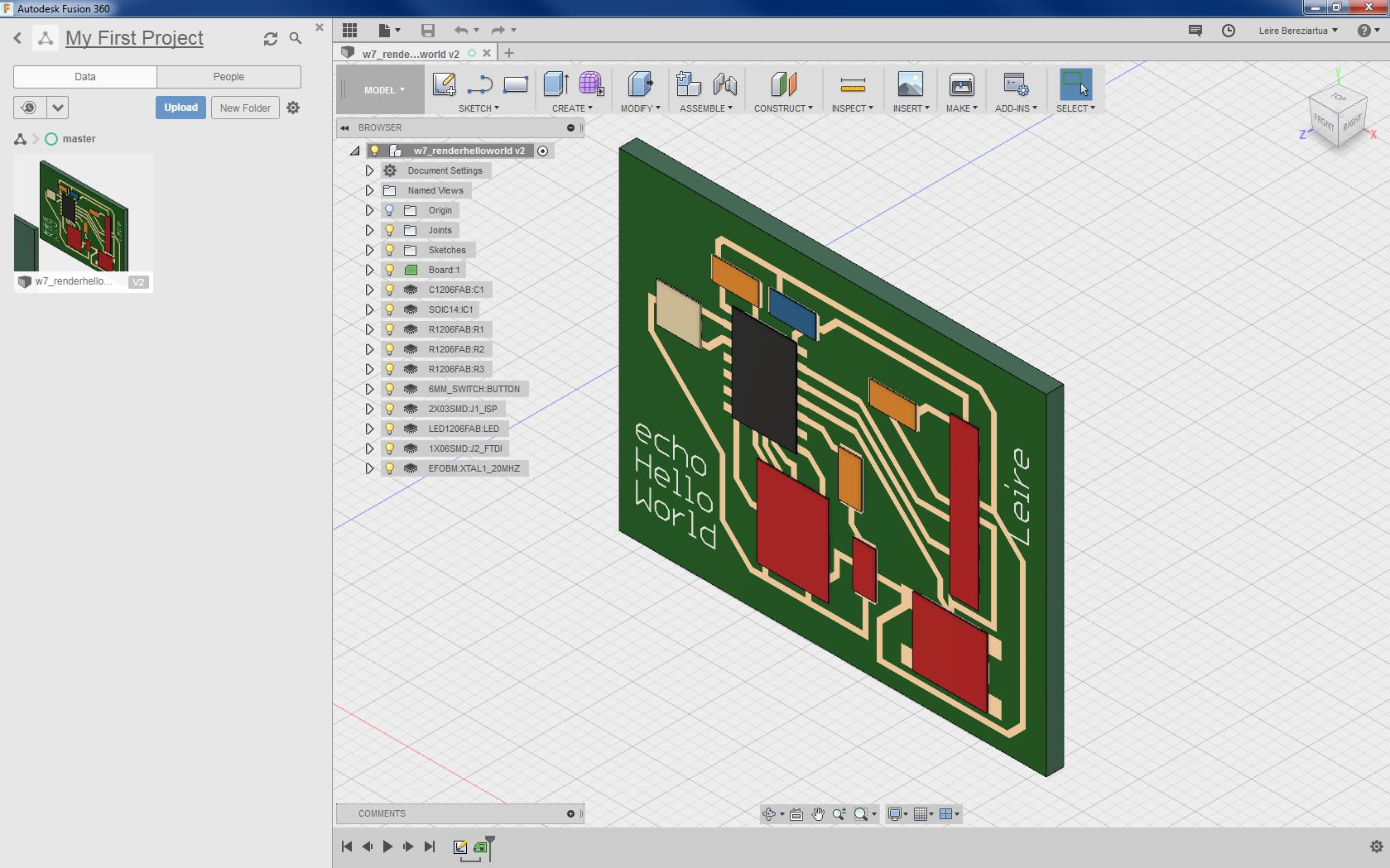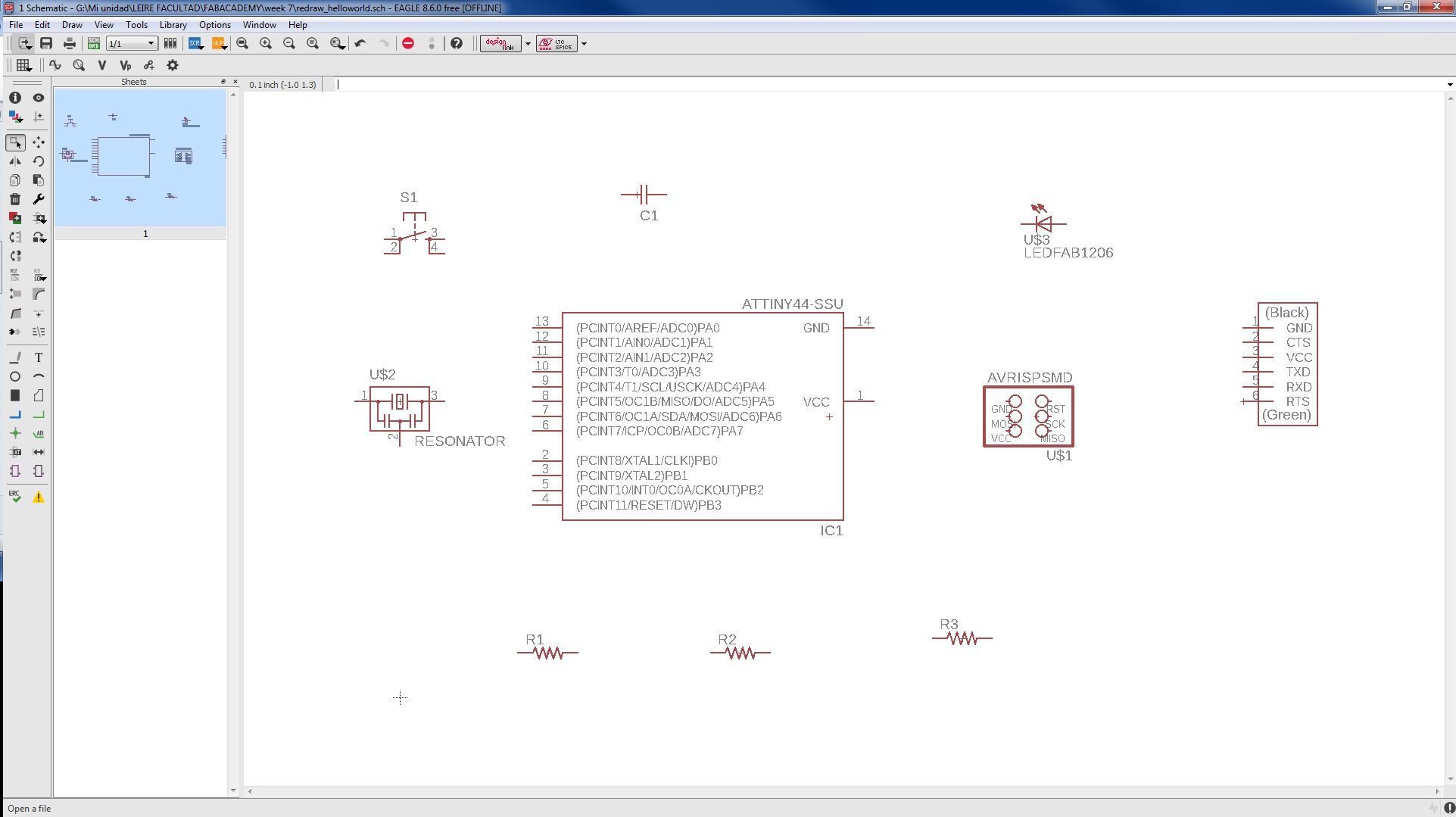 INDIVIDUAL ASSIGNMENT: _ redraw the echo hello-world board. + add (at least) a button and LED (with current-limiting resistor). _ check the design rules, make it, and test it. _ extra credit: simulate its operation. _ extra credit: render it. (3D) GROUP ASSIGNMENT: _ use the test equipment in your lab to observe the operation of a micro-controller circuit board, use the circuit made in the individual assignment
