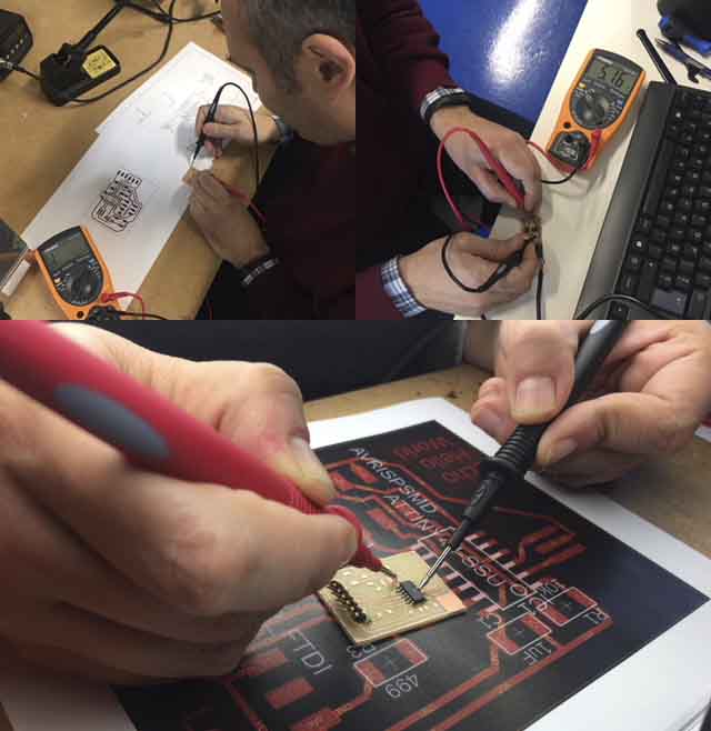 While I was soldering components, I test every pin and traces connection using a digital multimeter, to confirm that the traces were good and the board was receiving power.