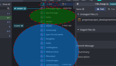 To commit your changes, you name the commit. For example, if I were adding images to my input week, I might name the commit "input images". If I were working with other people, I might then write a short message about why I am making the changes, or what exactly the changes do. Since I am working alone, I mostly name my commits something simple, and assume that I will remember what they mean. You then press "Commit changes to n files" where n is the number of files you have staged for the commit. You should now see the version list update change from having a WIP at the top to having the name of your latest commit at the top. As you can see, I have many commits ready for the next step.