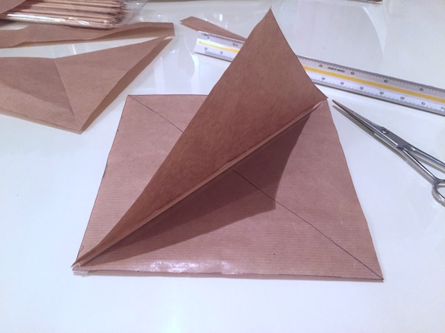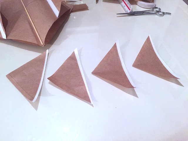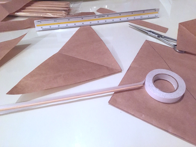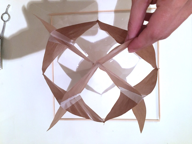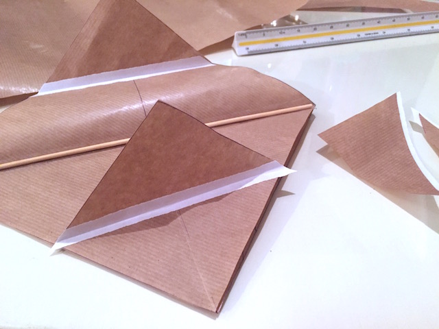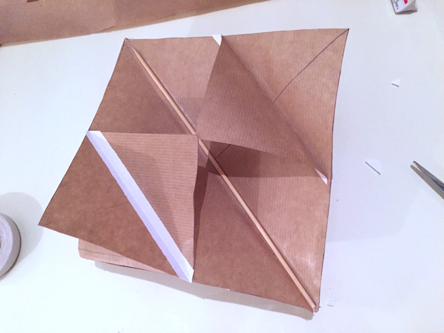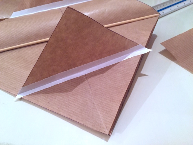 A kite structure is made from several sticks and some string. The sticks can be made of a light but strong piece of wood such as balsa or bamboo, or a light but strong plastic tube. In the box kite, there are four main "leg" pieces of equal length and four "cross" pieces which are made from two sticks. The structure is held together with strings wrapped around the legs at the location of the cross members.