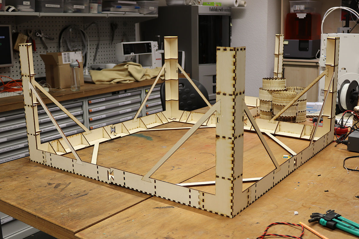So we ended up with this SkyCam inspired design that you can see in the pictures. We had a few reasons for this decision: We expected it to be less precise than a normal 3 axis machine but for our application that is fine. The advantages, on the other hand, are: We expected it to be faster. It would be cheaper than the alternative because we would only use wood and ropes. And this design is easily extensible. You can easily make the frame bigger or even clamp the four base towers anywhere down and have a bigger space to play with. And even this frame is bigger than we could have created easily with the design from a Prusa. So with that settled we gave one part to everybody to work on and integrated everything together.