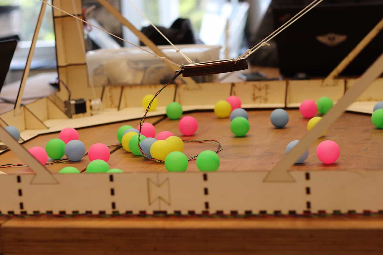 In this group assignment, we had to build a machine with multiple movement axis. All three participating fab academy students on our lab worked together on one project. We had many different ideas like drawing machines and cnc-tools, but in the end we decided to make a ball tossing game where the target moves when its hit. The planning of this machine was quite difficult because we had to decide how the target is moved. We discussed different solutions for this problem like using the same technique as the Prusa 3D printer used. But we decided that all those solutions would "overengineer" our machine.