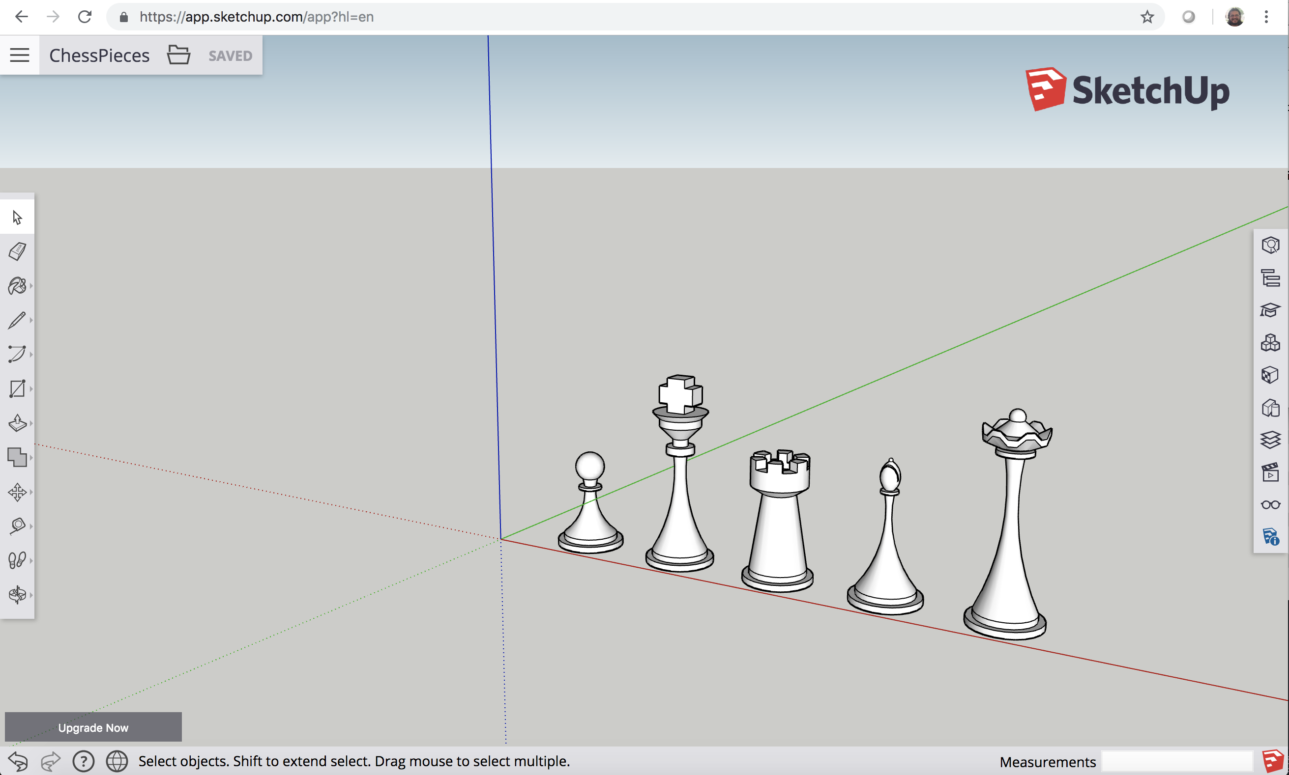 Figure 3.4: Screenshot of 5 chess pieces, viz. pawn, king, rook, bishop, and queen, created in SketchUp.¶