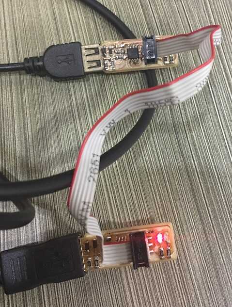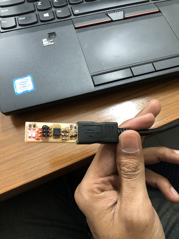 Next we need to connect the FabISP to USB port. We were recommended to buy a USB2.0 male to female cable by our remote instructor Puneeth. The red LED lights up.