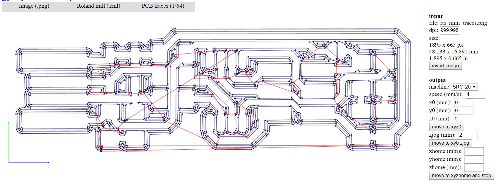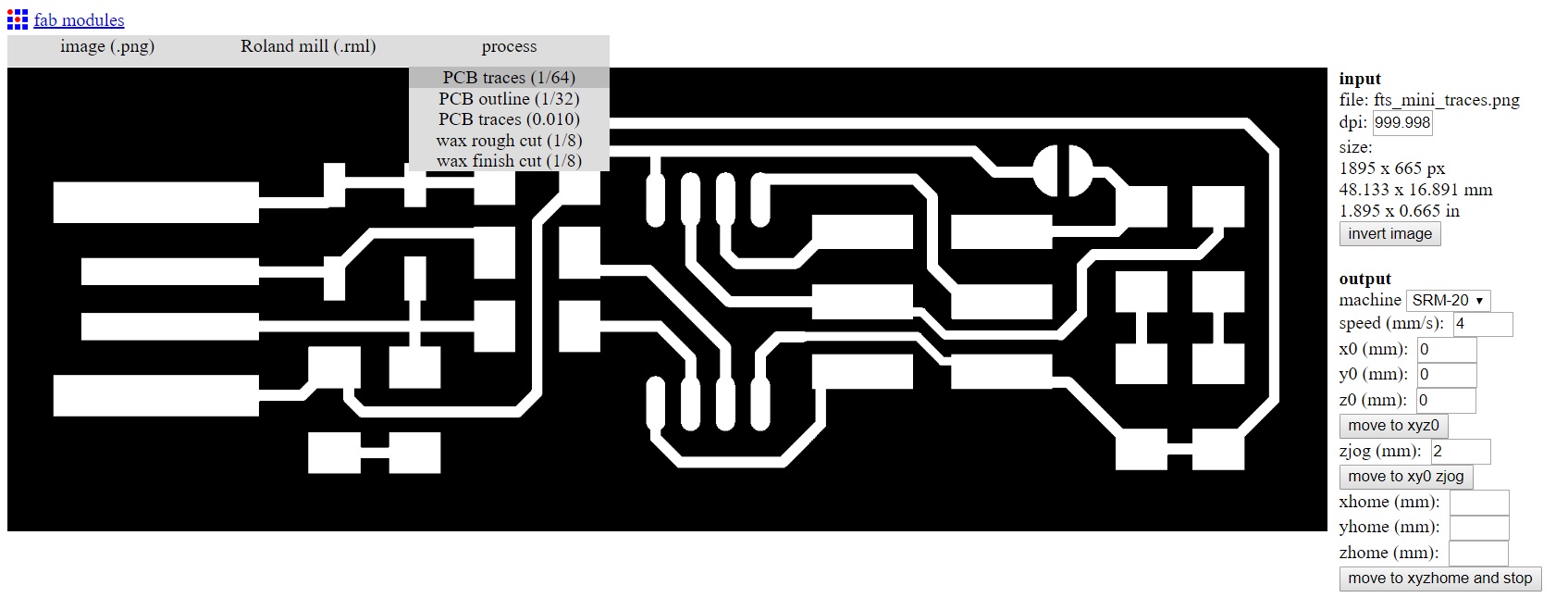 I used fab modules for converting this png image to rml file readable by Roland SRM-20 machine. The below images show the steps taken for creating a traces rml with the settings for a V bit.