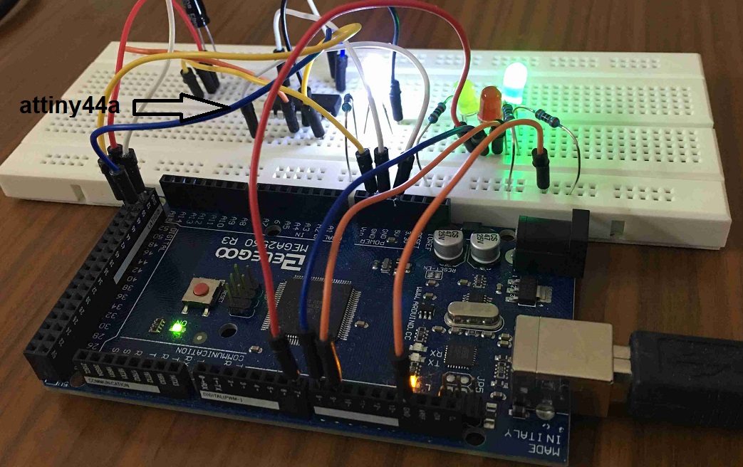 I first programmed ATTiny44 with an Arduino as an ISP on a breadboard. This provided some confidence of using other programmers as ISPs.