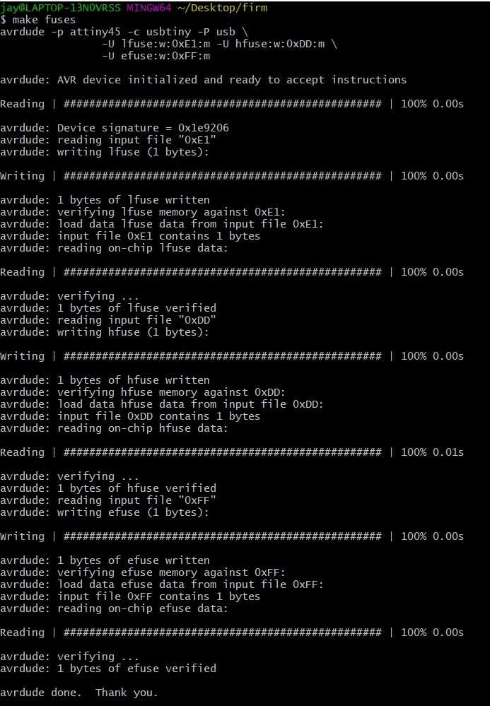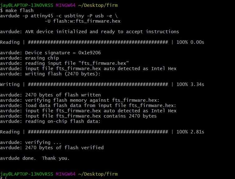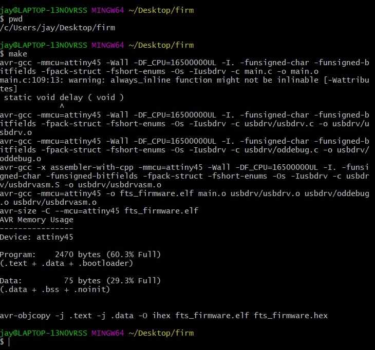 We need to run “make” on the terminal prompt to build a hex file which would be programmed onto ATTINY45. After the command completes we should have “fts_ firmware.hex” file in this directory.