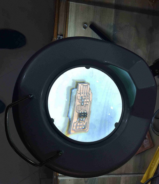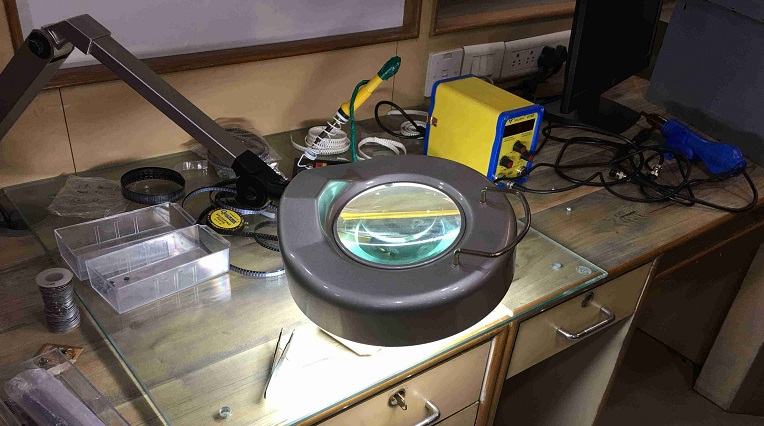I wanted to practice soldering with smd components while I resolved the other issues with copper traces. The below images show the lens and soldering station that we had. The lens is useful to magnify the image while soldering. This helps with the smaller smd components. I like to look into the lens while soldering.
