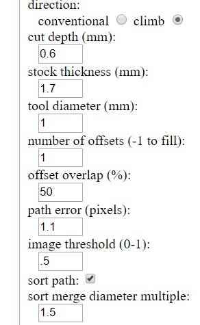 The only difference in the settings used for the parameters was for the offset to be -1. I also increased z depth by 0.05 mm or so at a time if the traces were not cut fully or if my V-bit was grazing the surface. One also needs to make sure that the V-bit has been tighetened enough for it not to move into the collet with pressure.