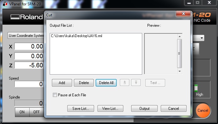 Here, we need to click on the Cut option in the first GUI screen. We delete all the previous files and select the rml file to be used for cutting. Once done, we click on Output to start milling.