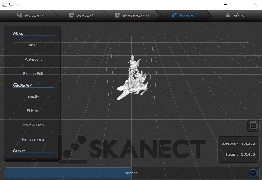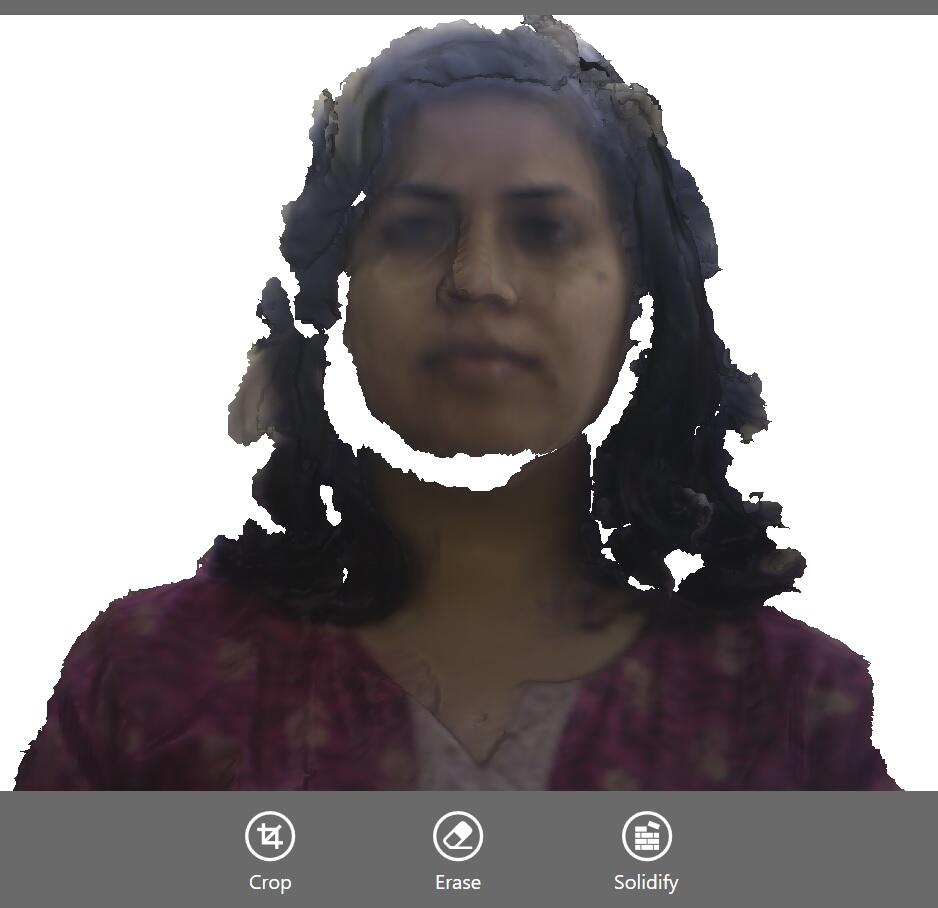 When the scan is complete from all sides, including the top, model can be created by working with the ‘solidify’, ‘crop’ and ‘erase’ options.