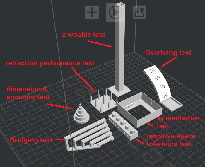 I also found these series of tests reviewed by the make magazine which I found more exhaustive. I downloaded the stl files for these shootout test models from thingiverse. These series of tests evaluate low cost FDM printers for: