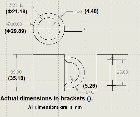 | Inner diameter | 21.43 | 21.18 | 0.25 | actual hole is smaller by ~ 1.2%. |