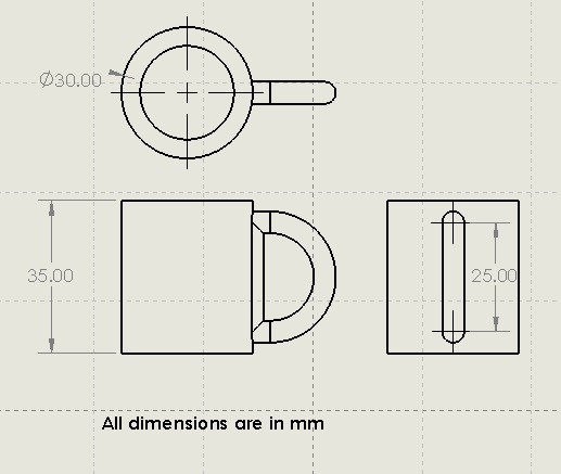 The cup was kept small to reduce the build time. The drawing shows the top, front and right hand side views.