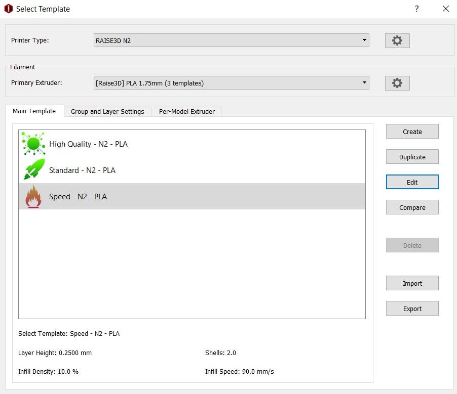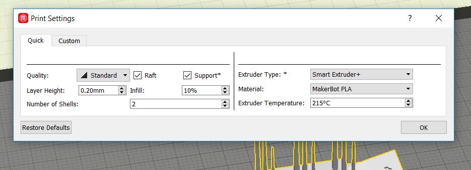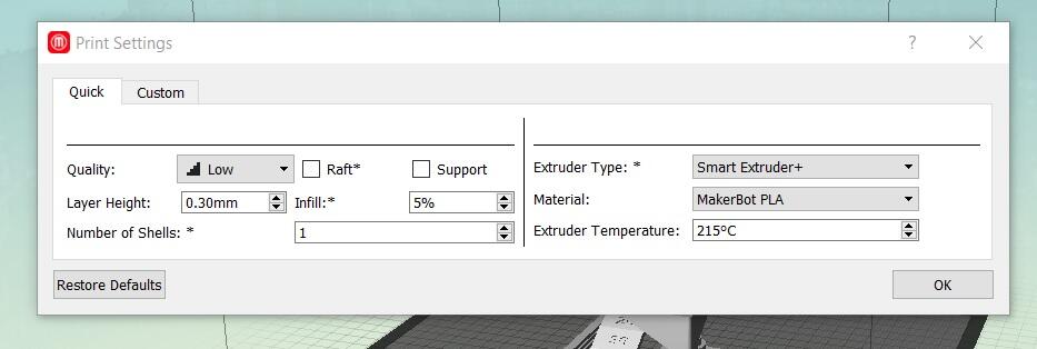 We could alter the print settings in this tab. We left the default settings for the test without the raft and support.