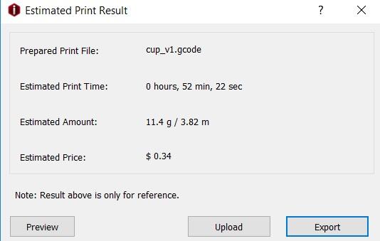 I sliced it to find the build time, which was 53 minutes. I then exported it into g-code which could be read by the printer.