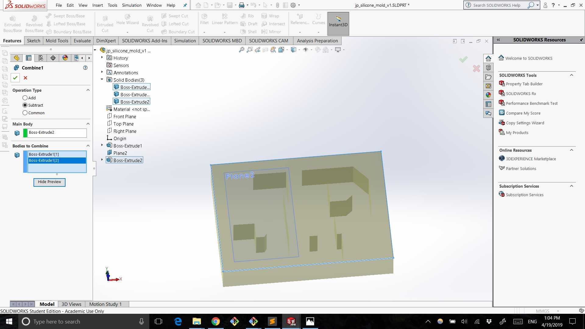 The silicone mold was subtracted from the bounding box using the combine feature as before.