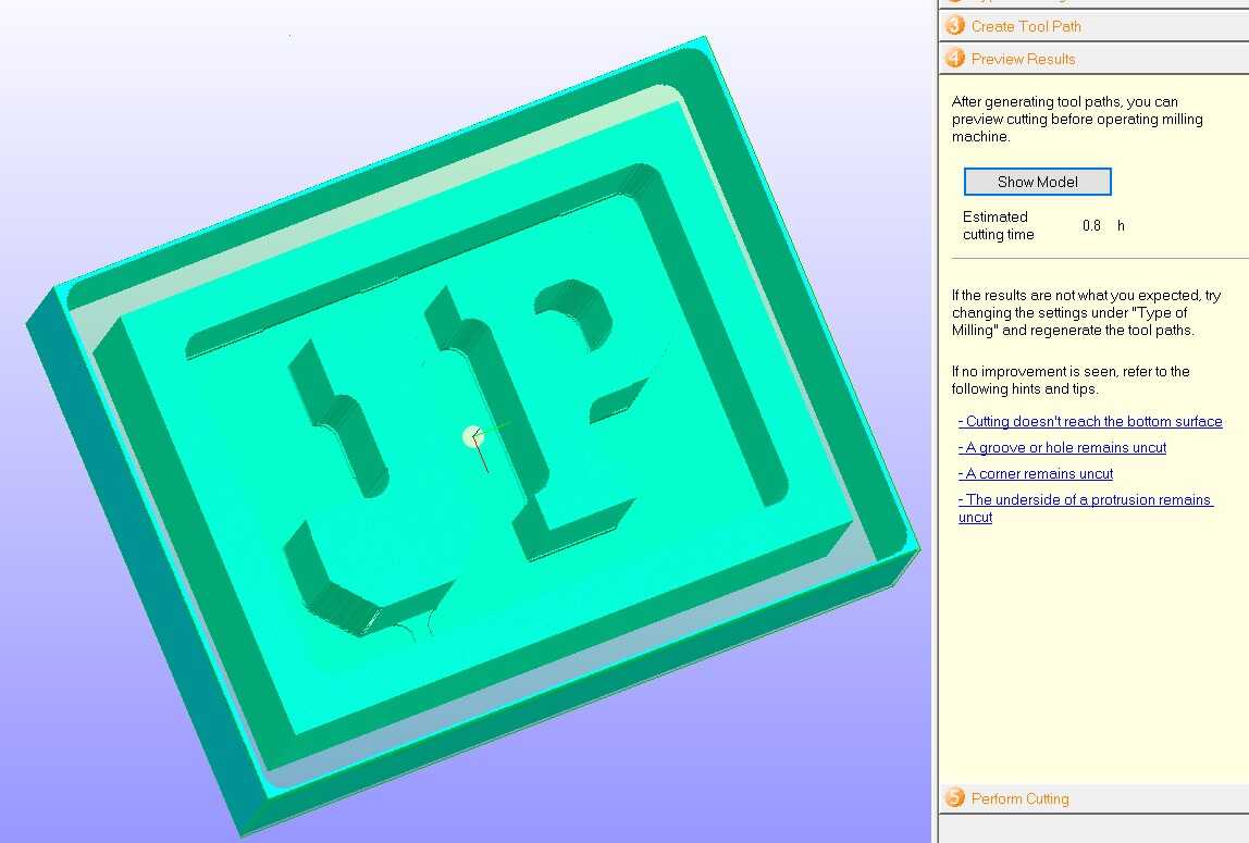 The cutting is carried out with a 4 mm square end mill and the roughing happends before finishing. The total estimated time of operation is 0.8 hours.