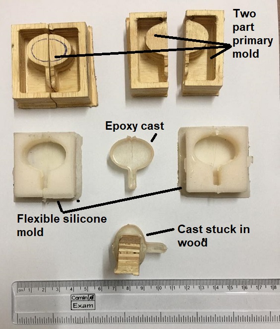 After curing the casts came out very easily. This image shows the plywood mold, the flexible silicone mold and epoxy casts side by side.